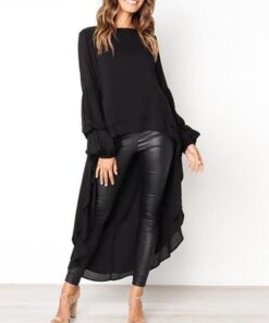 Round Neck Asymmetric Hem Plain Lantern Sleeve Blouses