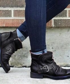 ⭐ Women‘s Retro Casual Soft Leather Pleated Zipper Belt Buckle Low Heel Ankle Boots