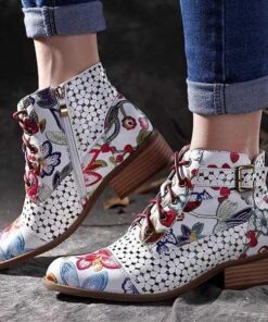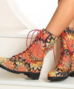 Floral Block Heel Round Toe Lace-up Mid-calf Cowboy Boots