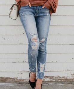 ⭐Regular Waist Solid Color Skinny Fit Hole Jeans