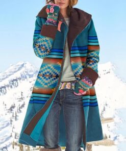 Vintage Geometric Jacquard Outerwear Buttoned Color-block Hooded Coat