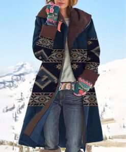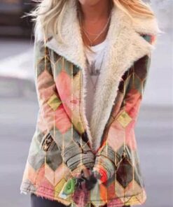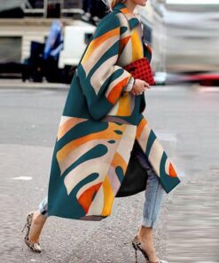 Women Vintage Print Button Long Sleeve Woolen Warm Coat