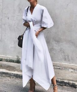 Tie Waist Solid Color Irregular Short Sleeve Dress For Women