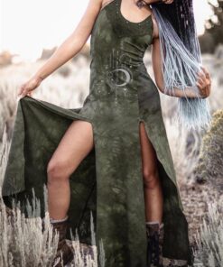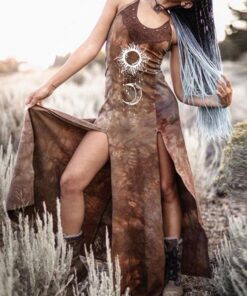 Women’s Retro Dyeing Lace Sun and Moon Print Split Dress