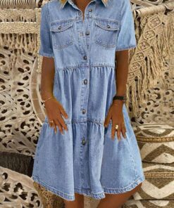 Sky Blue Denim Daily Casual Shirt Collar Short Sleeve Buttoned Pockets A-line Dresses