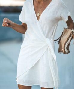 Summer Solid V-Neck Cross Short Sleeved Dress