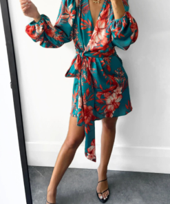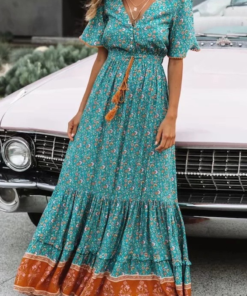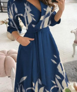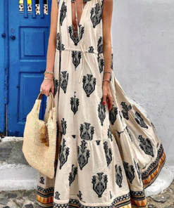 ?Fashion Print Split Joint V Neck Waist Skirt Dresses