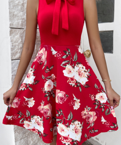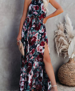 ?Fashion Print Split Joint Halter Waist Skirt Dresses