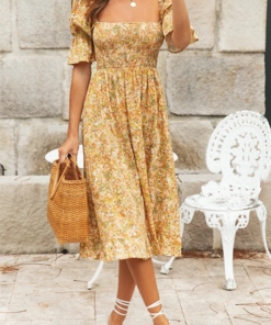?Fashion Elegant Floral Flounce Fold Square Collar Dresses