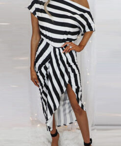 ?Fashion Street Striped Split Joint Off the Shoulder Irregular Dresses