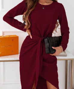 ?Fashion Elegant Solid With Belt O Neck Long Sleeve Dresses(3 colors)