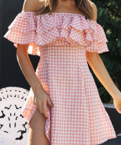 ?Fashion Sweet Plaid Split Joint Flounce Off the Shoulder A Line Dresses