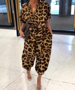Solid Color Fold-Over Collar Single-Breasted Short-Sleeved Jumpsuit