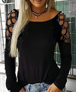 Plus Size Shirts Women Casual Hollow-Out Shoulder Long Sleeve T Shirts Blouse Tops