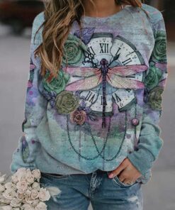 Vintage Dragonfly Printed Long Sleeve O-neck T-shirt For Women