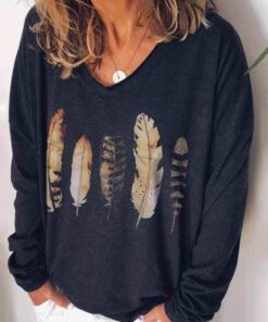 V Neck Feather Printed Fall Women Casual Printed Shirt &Tops