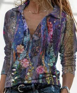 Vintage Floral Print Long Sleeve Shirt Collar Blouse