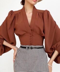 Women Elegant Solid Lantern Sleeve Button Decor V Neck Blouses