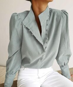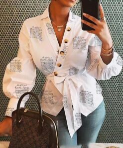 Women Letter Print Lace up Lantern Sleeve Button Decor Shirts Blouses