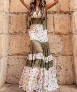 Women Deep V Neck Ruffle Patchwork Elegant Dress