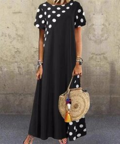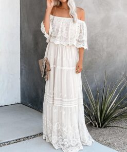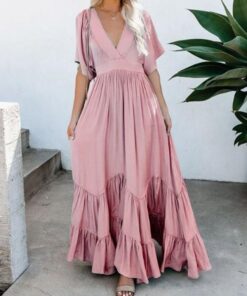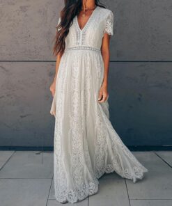 Women’s Maxi Shift Dress Short Sleeve Geometric Lace Deep V Basic Dress