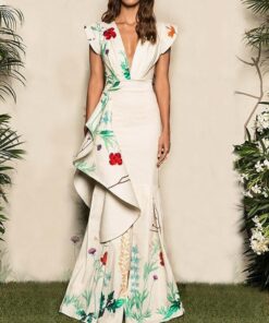 Fashion Fluted Cotton Sateen Floral Maxi Dress