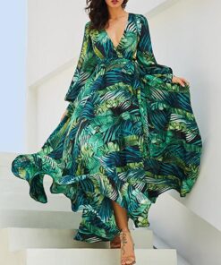 Green Tropical Beach Vintage Maxi Dresses Boho Casual V Neck Belt Lace Up Plus Size Dress