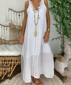 Linen Lace Trim Pure Color Split Maxi Dress