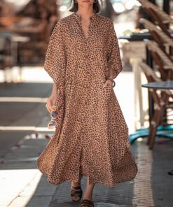 Leopard Pocketed Button Front Side Slit Sleeved Maxi Cover Up*