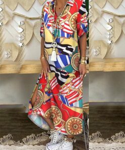 Plus Size Print Paneled 3/4 Sleeves Casual Slit Maxi Shirt Dress