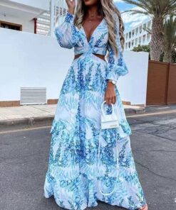 Long Sleeve Print V-Neck Floor-Length Expansion Women’s Dress
