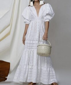 Personalized V Neck Highwaist Hollow Ruffle Puff Sleeve Maxi Dress
