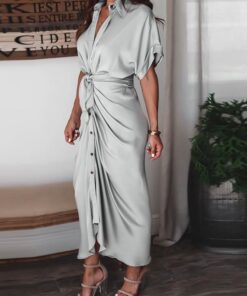 Satin Pleated Classy Bandage Shirt Dress