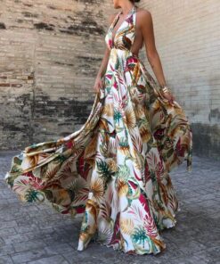 V Collar Sleeveless Summer Holiday Print Maxi Dress