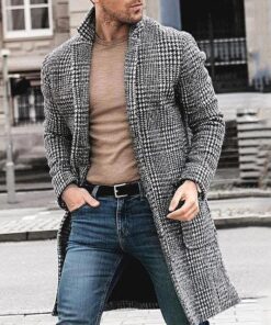 Mens Trench Coat Trendy Plaid Pattern Woolen Button Over Coat
