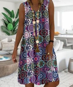 Vintage Printed V-neck Sleeveless Midi Dress