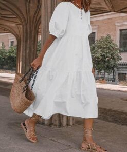 Women Fashion Puff Sleeve Open Back Prom Midi Dress