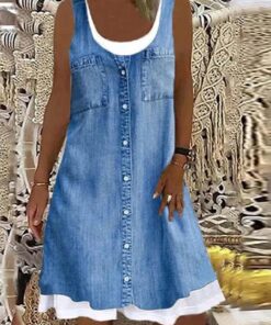 Vintage Summer Solid Blue Patchwork Contrast Sleeveless Dress*