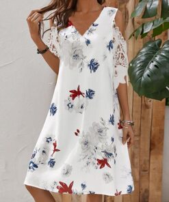Women V Neck Cold Shoulder Lace Sleeve Print Dress
