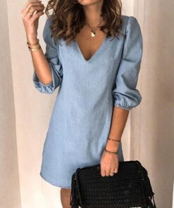 Women Casual Denim Shirt Dress Long Sleeve Loose Shirt Dress