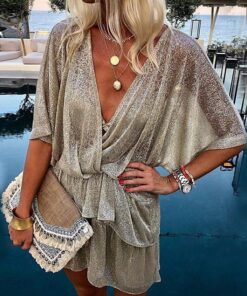 Women Transparent Batwing Sleeve Lace up Waist Sexy Dress