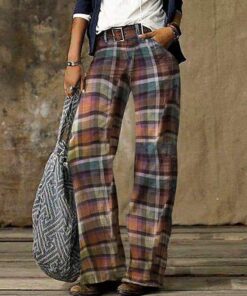 Vintage Color Block Plaid Print Pocket Woman Pant Bottom