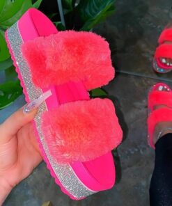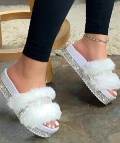 Women Faux Fur Rhinestone Casual Slip On Slippers