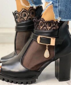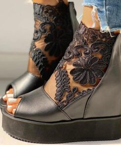 Women Fashion Lace Mesh Peep Toe Chunky Sandals Boots
