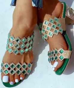 Women Fashion Rhinestones Bling Slip On Chunky Heel Slippers