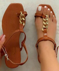 Women Fashion Pu Chic Chain Toe Loop Adjusting Buckle Flat Sandals