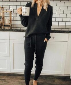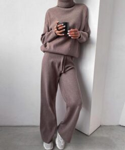Pure color casual high-necked long-sleeved sweater and trousers women’s suit