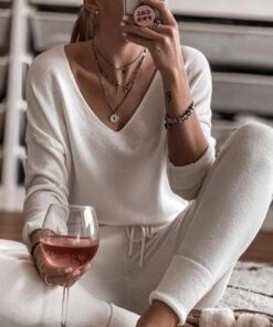 Simple V-neck Long-sleeved T-shirt and Drawstring Sweatpants Suit