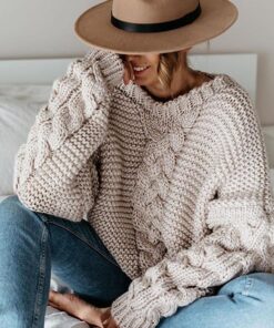 High Neck Loose Cable Knit Pattern Stitching Sweaters Tops