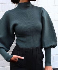 Solid Turtle Neck Ribbed Sweaters Lantern Sleeve Womens Knit Sweaters